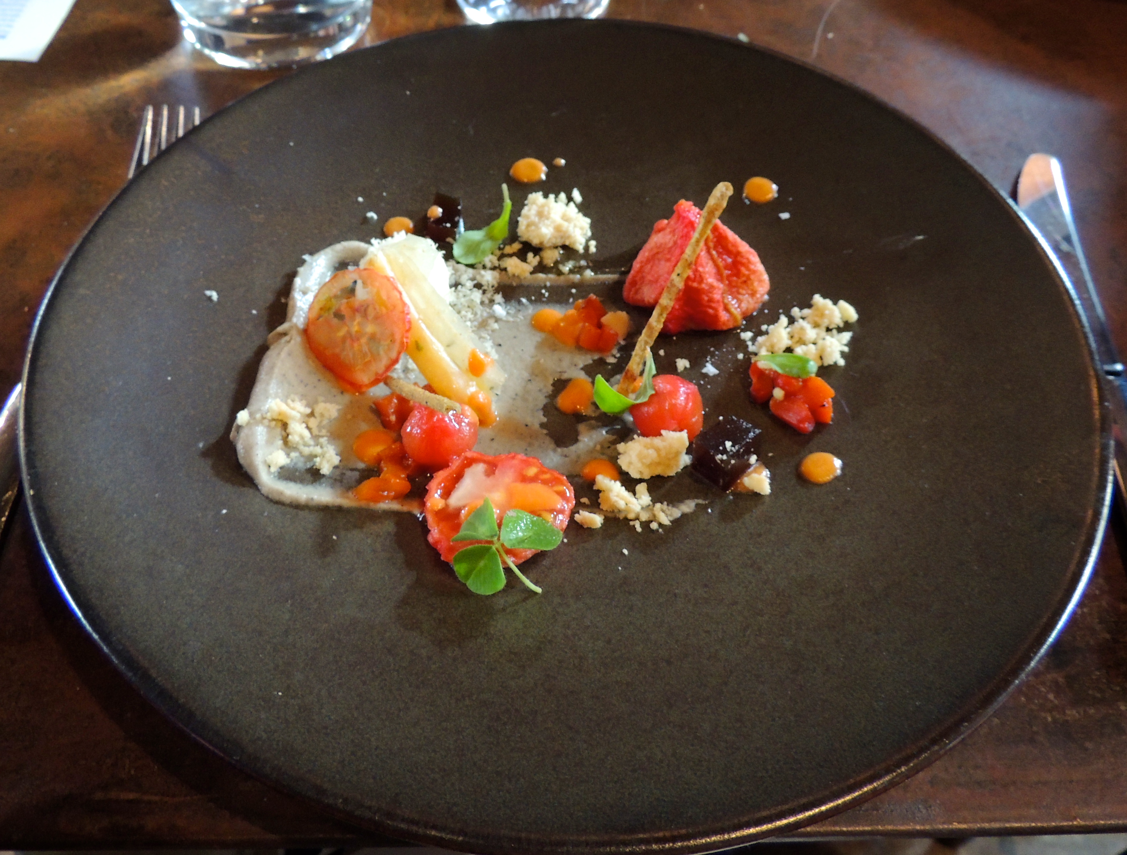 First course – Test Kitchen tomato, black sesame and aubergine puree, burnt aubergine jelly,